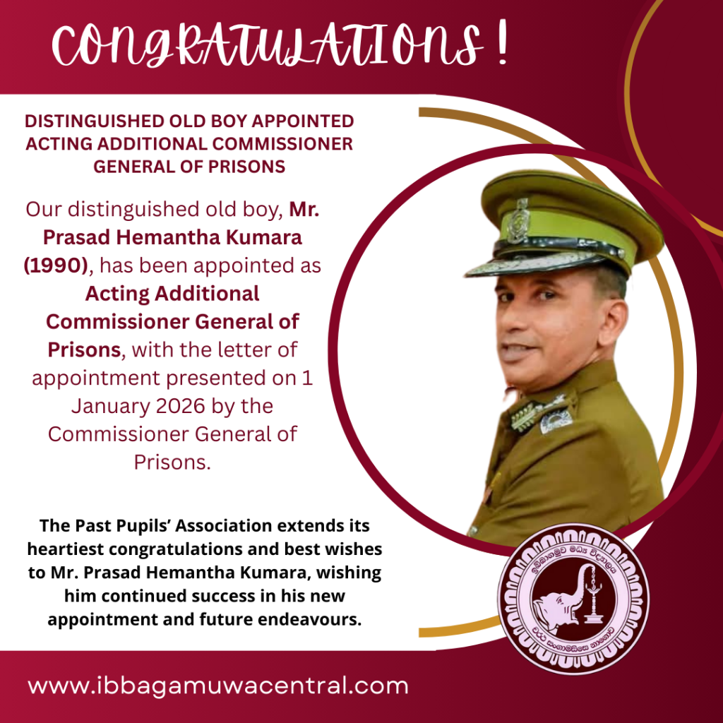 Our distinguished old boy, Mr. Prasad Hemantha Kumara (1990), has been appointed to cover duties in the vacant post of Acting Additional Commissioner General of Prisons in the Department of Prisons.